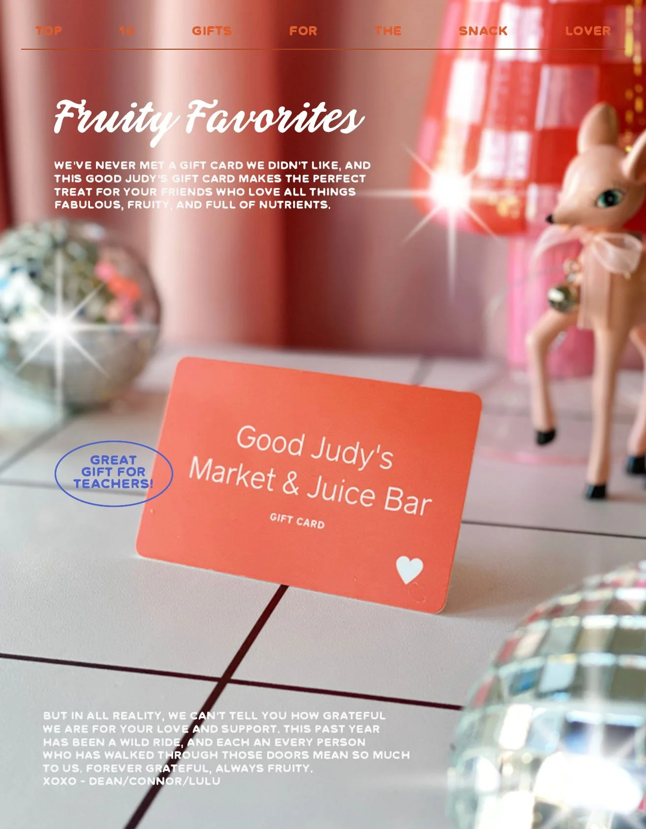 Ditch the gift-guessing game and head to our store for the classic, tangible joy of picking out a physical gift card. It's like handing over a little slice of happiness! You can also send Good Judys