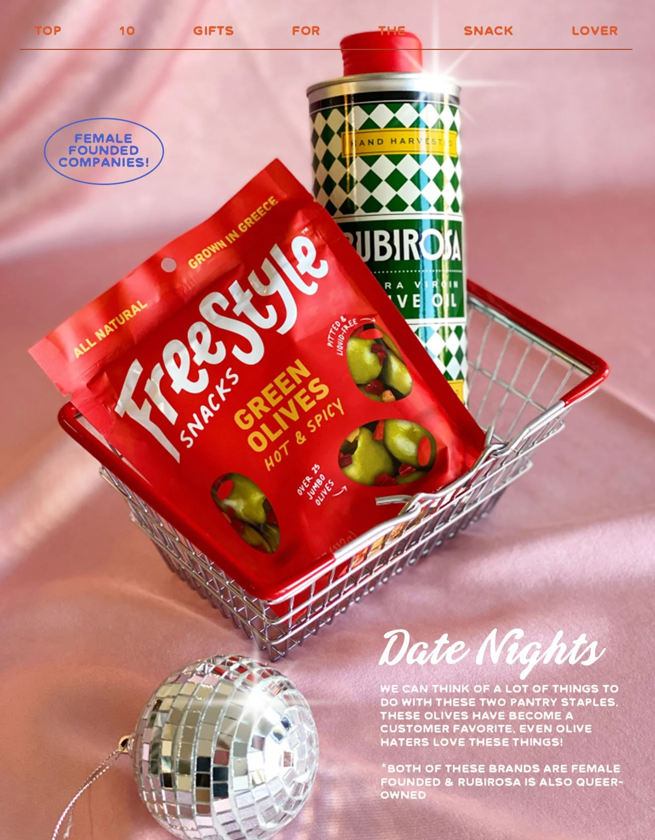 Olives are having a moment this year, and we’re excited to feature Freestyle Gourmet Snacking Olives in our holiday gift guide! These flavorful olives make the perfect stocking stuffer for the martini lover in your life, adding a delicious twist to their cocktail experience.